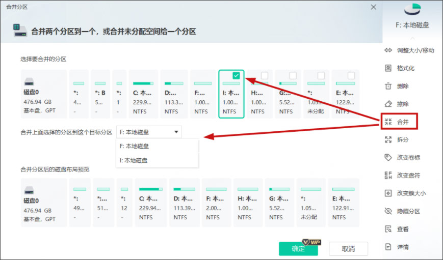 2)合并分区,拆分后,我们选择这个F盘,点击右侧合并操作,选择一个要合并的盘,这里我们选择I盘,同时我们可以选择合并的形式,是将F合并到I,或者将I合并到F,建议是将没有数据或数据较少的盘合并到另一个盘上,以免造成合并过程中数据丢失的问题。