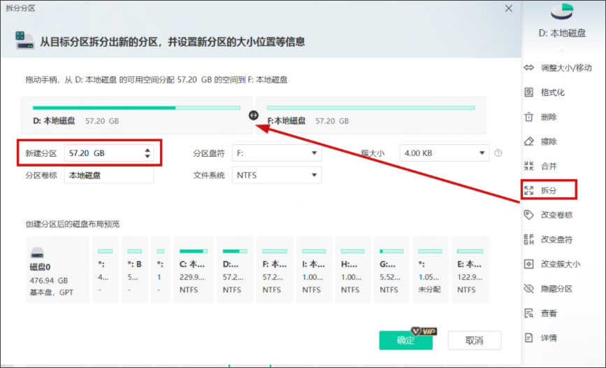 如下图,选择D盘,点击右侧拆分操作,同样的可以拖动分区条或者手动设置拆分出去的盘的空间大小,可以为其选择一个盘符,例如F盘,这样拆分后就可以得到一个新的磁盘分区了。选择后我们点击确定按照步骤执行就可以啦