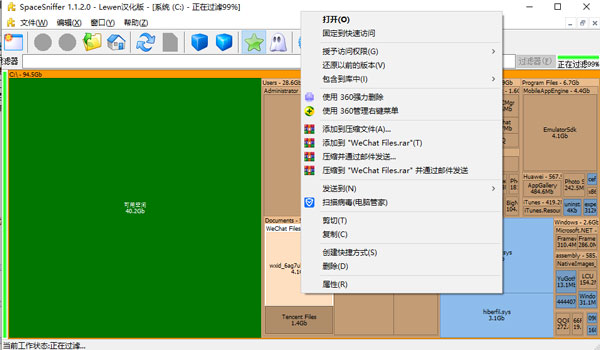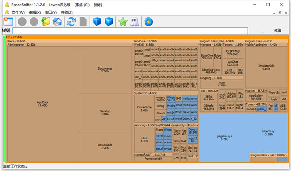 Spacesniffer中文版是一款强大的硬盘空间分析工具,能够支持通过图形化界面显示硬盘中各个磁盘的每个文件夹所占用的存储大小,并通过直观的图形界面以及颜色区别,你可以十分清晰的看到在硬盘中的占用情况。软件独有的智能缓存扫描引擎,多层视图,支持二次扫描优化整体布局,在使用中同样也可以保持同步,使用闪烁的方式进行警告提醒,让你能够充分的了解到硬盘的占用情况,还可以通过输入简单但是功能强大的过滤条件进行内容筛选,可以通过它把那些占用磁盘比较大的文件进行删除,极大的方便了你整理你的磁盘空间。ps:这次小编给大家带来的是SpaceSniffer完美汉化版,此版本是绿色版的,在不缺少任何功能的情况下,已经全界面汉化,用户无需安装即可正常使用,感兴趣的朋友快来下载体验吧。