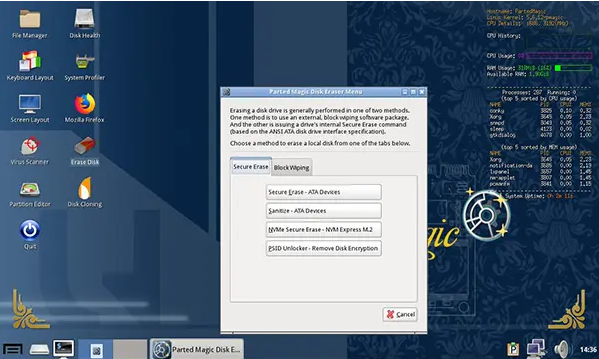 Parted Magic为传统的覆写提供了易于使用的解决方案。内部安全擦除。只擦除自由空间。
