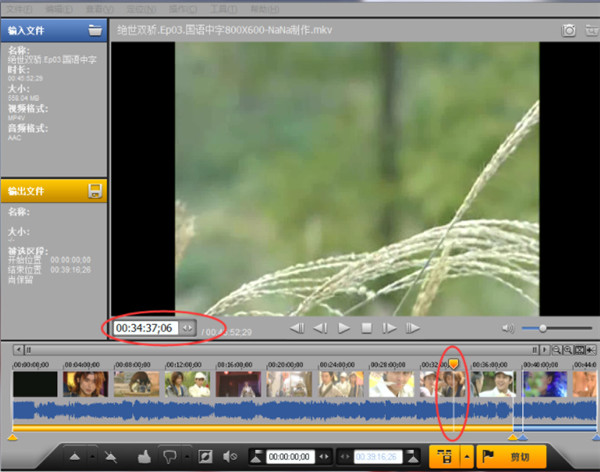 3、?其次,输入时间码或直接用鼠标拖动时间轴上的长针来决定截取视频的起始点与结束点。点击键盘上的光标移动键(左右箭头)可以?逐帧进行细致调节。