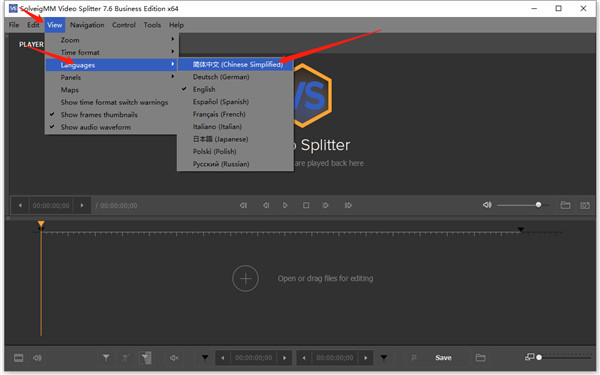 1、打开在本站下载的solveigmm video splitter 7.6中文绿色便携版,打开首页是英文,所以我们可以点击 View > Languages > 简体中文将它设置成中文页面