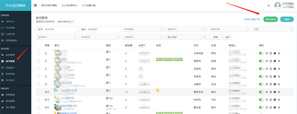 登录小火花管理后台,批量或 手动导入自媒体账号