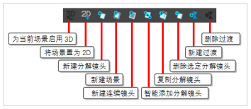 Storyboard(故事板)工具栏包含添加与删除分解镜头、镜头和过渡等相关的所有基本命令,也可以通过该工具栏在 2D 和 3D 工作区之间切换。