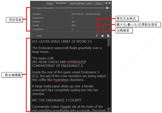 Storyboard(故事板)视图显示项目的基本信息。 可以在此为故事板编写、导入、查看和编辑剧本。