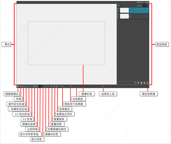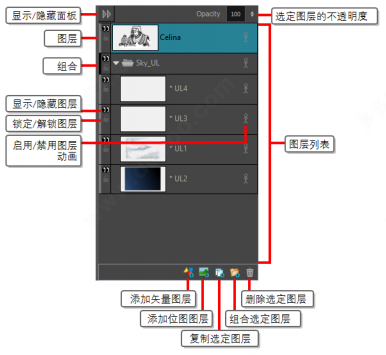 图层面板显示在舞台和摄像机视图的右侧部分。 可以在此添加、删除、复制、分组、重新排序、隐藏、显示、锁定或解锁图层;启用或禁用图层动画;改变图层的不透明度;以及选择在哪个图层上绘画、操作或创建动画。
