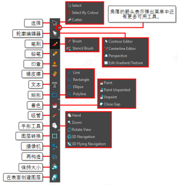 Tools(工具)工具栏包含在 Storyboard Pro 中工作所需的主要工具。 在默认工作区,该工具栏位于应用窗口左侧。