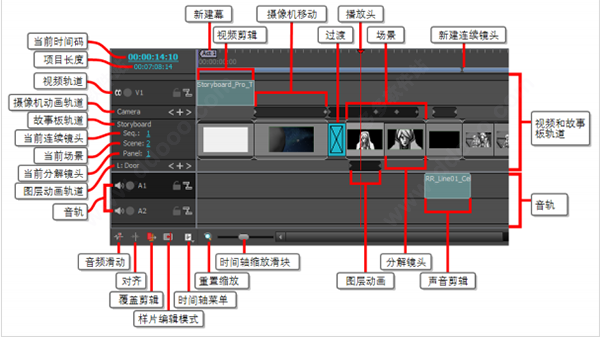 时间轴视图可以在制作样片的时候替换缩略图视图。 样片是依据故事板生成的视频,其中的每个分解镜头均大致按照其所表现的动作定时出现,并且其中的摄像机移动均已动画化,以用作影片的定时基础。 与缩略图视图一样,可以通过时间轴视 图创建和管理分解镜头和场景。 除此以外,还可以决定每个场景和分解镜头在样片中占据的时间、为摄像机移动创建动画、创建图层动画,以及将声音剪辑、图像和视频添加到样片中等等。