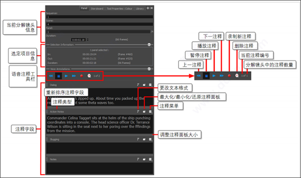 Panel(分解镜头)视图显示当前选定分解镜头相关的基本信息。 还可以在此查看和编辑当前分解镜头中的注释,以及在分解镜头中添加草图或语音注释。