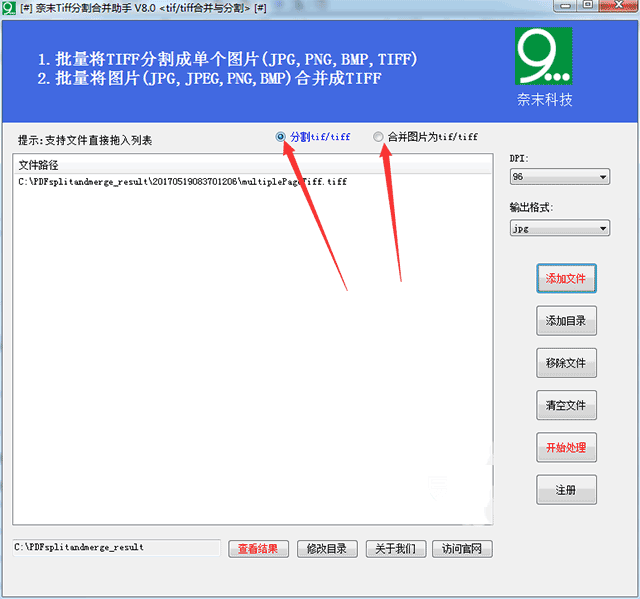 奈末tiff分割合并助手是奈末科技推出的一款纯绿色的Tiff分割合并软件,能够支持批量将多页的tiff分割成单个图片(JPG、PNG、BMP、TIFF)和批量将图片合并成TIFF。软件绿色免安装,简单实用,能够支持tiff转JPG、TIFF转JPG、TIFF转PNG、TIF转BMP、JPG合并转TIFF、PNG合并转TIFF、BMP合并转TIFF等功能,简单易用,有需求的朋友请下载体验。