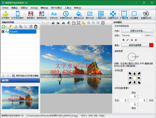 可以看到添加的水印已经按照规则显示到图片中,此时可以在右侧水印属性区域修改水印的位置、颜色、字体字号、水印边距等信息;