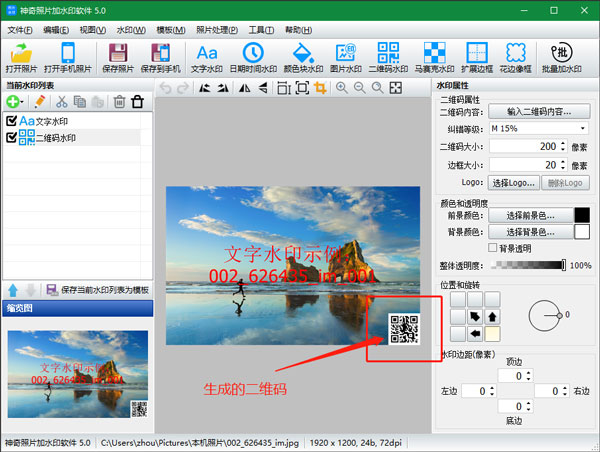 可以看到添加的二维码水印已经生成并显示到图片中,此时可以在右侧水印属性区域修改水印的位置、颜色、二维码大小、透明度、Logo图片、水印边距等信息;