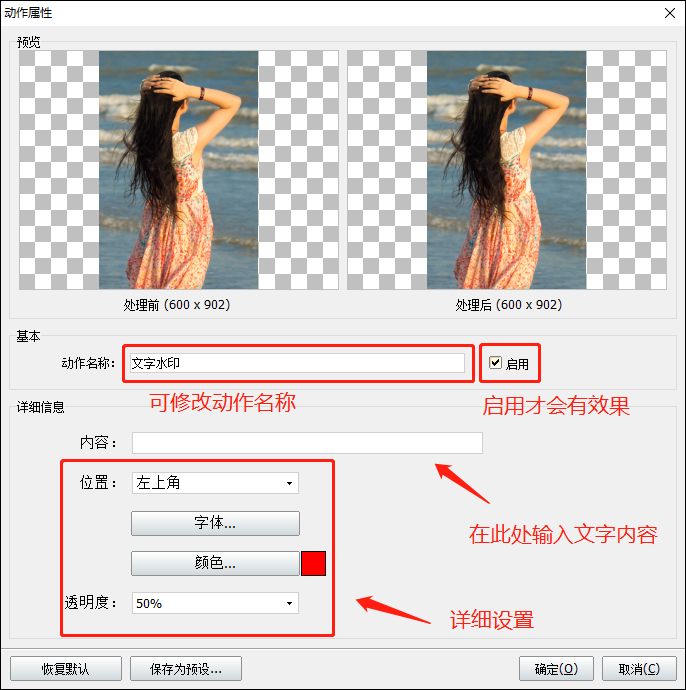 图片处理动作包括水印添加、边框添加、尺寸修改、颜色修改。