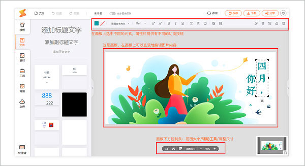 ② 左侧栏的标签:【文本】添加文字到画板、【素材】添加快图内置素材到画板、【上传】上传我们自己的图片