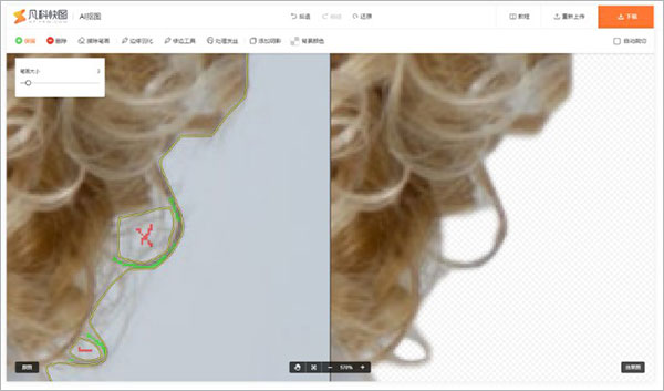 9、类似于发丝、羽毛这类难抠的部位,使用 [处理发丝] 画笔涂抹头发边缘;
