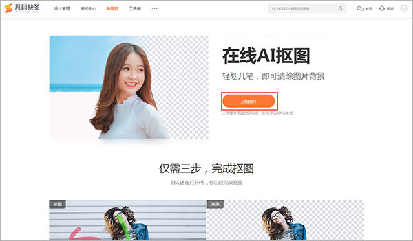 2、点击【上传图片】按钮,选择你要去掉背景的图片,上传成功后会直接进入抠图编辑器;