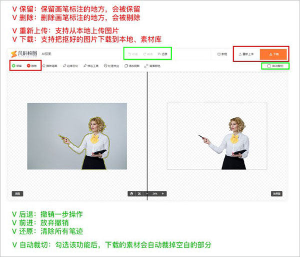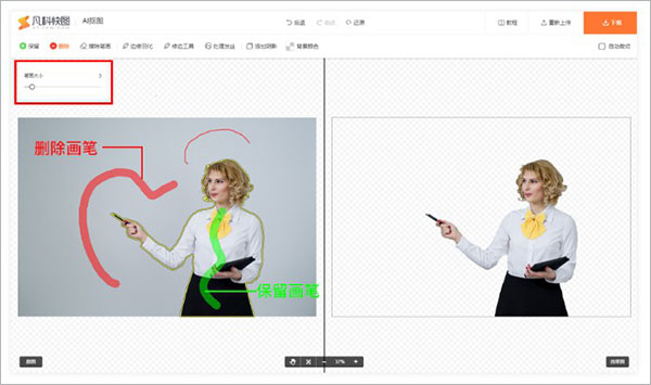 3、编辑器功能使用非常简单,我们只需要了解两个画笔就可以上手抠图了,