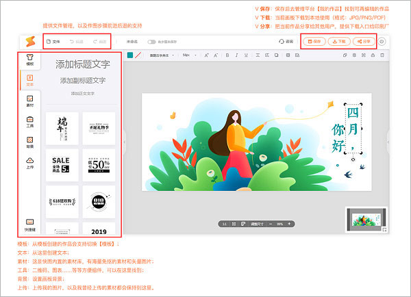 模板创建之后,我们仅需要在图片编辑器里改动文字或者部分图片素材就可以完成一张质量较高的图片;