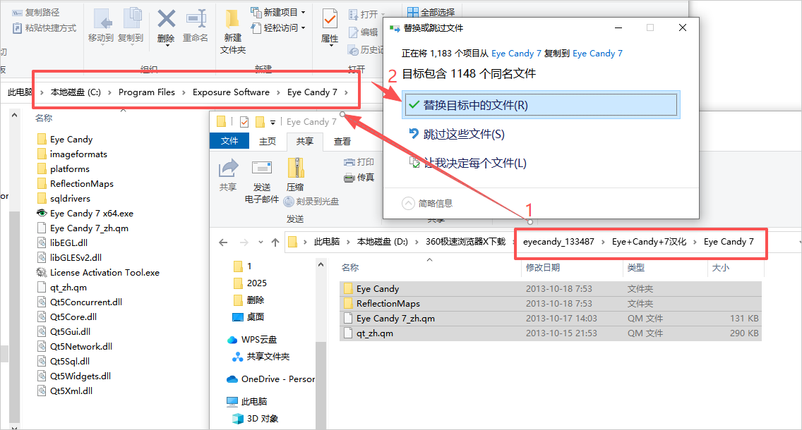 5、接下来,对软件汉化操作,将汉化补丁(Eye Candy 7文件夹的所有文件)复制到【C:\ProgramData\Alien Skin\Eye Candy 7】和【C:\Program Files\Exposure Software\Eye Candy 7】两个文件夹下;