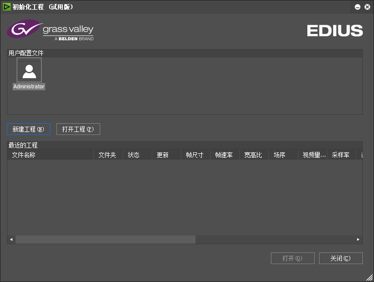 2、随后会出现EDIUS的初始化工程屏幕。现在需要新建一个工程预设,因为在进入工作前,你得预先告诉EDIUS:你的视频是PAL制还是NTSC制?标清还是高清?是否使用支持的硬件等等细节信息,这些被统称为一个工程预设。点击“新建工程”。