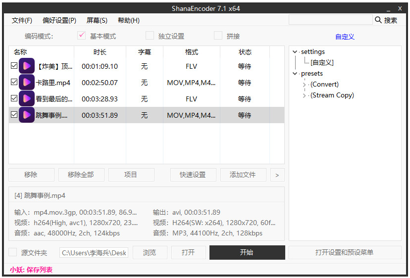 在使用方面,ShanaEncoder提供了详细的向导式操作流程,用户只需几步就能完成视频转换。无论是格式转换还是参数调整,软件都能轻松应对。对于需要批量处理的用户,预设功能也能大大节省时间。