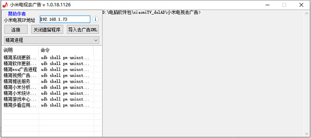 小米电视去广告是有吾爱网友推荐分享的一款绿色免费,功能实用的小米电视去广告软件。它是一款可以去掉小米电视广告播放的电脑工具,加入了网上搜集来的小米电视各种命令,看需要执行,理论上添加其他电视的命令后,这个软件也可以支持非小米品牌的电视。如果你嫌小米电视的广告太长的话,那么这款工具就可以帮你一键去除视频广告,轻松搞定这样的烦恼,从此看电视无广告,让你看过瘾,有需求的用户请下载体验!