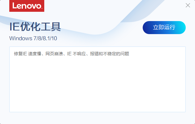 联想IE优化工具是由联想售后工程师研发的一款能够帮助用户解决IE浏览器应用程序,能有效解决用户浏览上网遇到一些常见不能上网延迟等问题,支持修复IE速度慢、网页崩溃、IE不响应、报错和不稳定的问题,有效让您IE浏览返回到初始干净的状态给你提供稳定、安全上网体验!