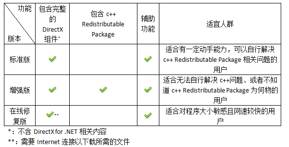 DirectX修复工具拥有为标准版。标准版、增强版、在线修复版,其区别如下图所示:
