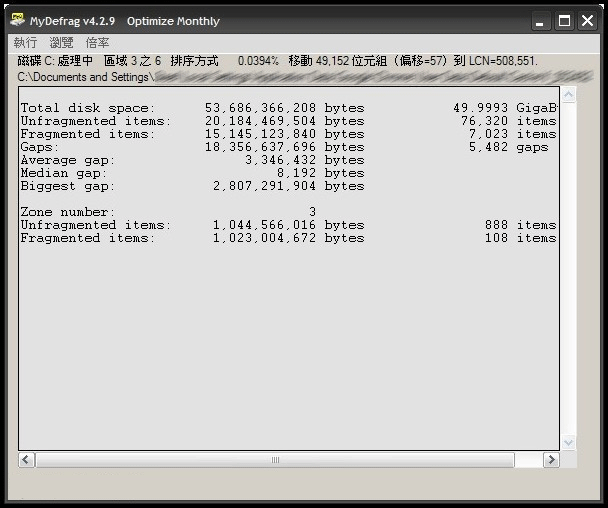 下图为重组时所显示的画面(磁碟地图),依照颜色分佈的杂乱度可看出档案分散的程度,上方红框的部份显示“目前重组的磁碟机代号、重组区域(共分6区)、执行进度”…等讯息