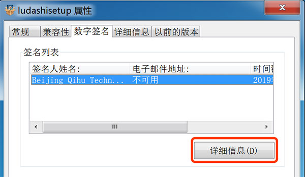 注意:如果看不到“数字签名”页面的话,那么可能下载到了被恶意篡改的鲁大师,需要提高警惕