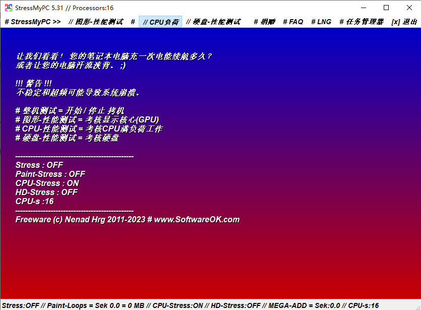 1、StressMyPC:开始/停止压力测试