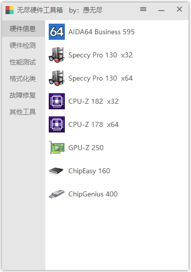 无尽硬件工具箱是一款非常好用的硬件检测工具合集包,由大神愚无尽制作,软件内含有硬件信息检测、电脑性能测试、电脑格式化、故障修复等6大类硬件相关软件,其中每一款都是精挑细选,都是同类软件中最好用最强的,点击图标即可打开使用,可以帮助你解决一系列的硬件问题,非常的强大。它能够帮助用户全面了解计算机硬件配置、优化硬件性能、解决硬件故障、管理驱动程序以及清理优化系统。无论是计算机爱好者还是普通用户,都能从中受益,欢迎有需求的用户前来下载使用。