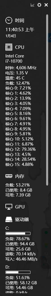 Sidebar Diagnostics是一款专业的硬件监控软件,这款软件运行后能够直接和系统外观融合在一起,保证简约和美观,其也能够监控和显示的硬件信息非常多,包括时间、日期、cpu的型号、温度、负载、网络IP地址、上传下载速度、内存使用率、显卡的型号、负载、温度、风扇转速,每个分区硬盘使用量、读写速度等信息。另外,Sidebar Diagnostics还可以调整显示区域的宽度、背景颜色、透明度、文字大小、对齐方式、颜色、日期格式等和外观有关的选项,非常方便,有需求的用户快来下载体验吧!