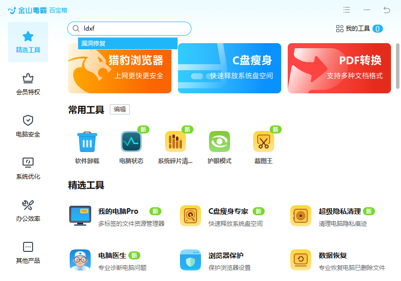 1、打开金山毒霸,百宝箱,搜索“漏洞修复”(输入拼音首字母ldxf),