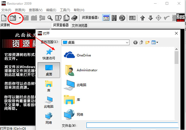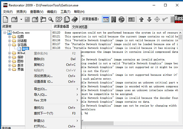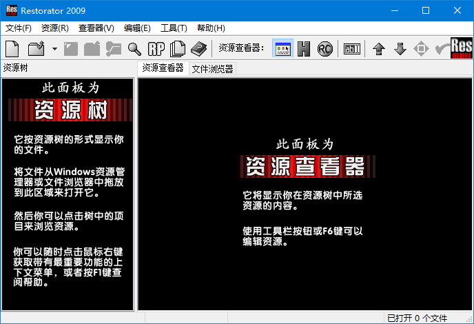 Restorator 2009界面可分为两个部分,左边是资源树显示目标文件的整体资源列表,右边则是资源查看器,可以显示选中资源的详细信息。
