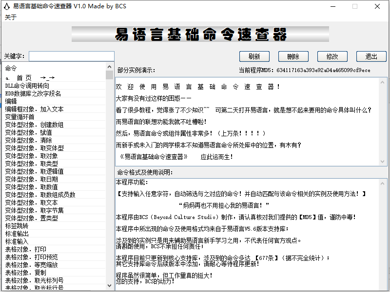 但是对于初学者还是有点难上手,为此小编特别带来了易语言基础命令速查器官方版,该软件收录了677条常用的基础命令,用户只需直接搜索命令的格式、英文名称、变量、参数以及含义,即可轻松帮助初学者更快的掌握易语言,欢迎免费下载。