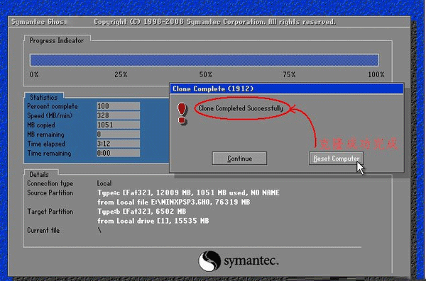 8、弹出成功完成对话框,点什么无所谓了,此时系统已经恢复如初了。单击“Reset Computer”重新启动电脑,单击“Continue”(意为:继续)则回到Ghost的初始界面。