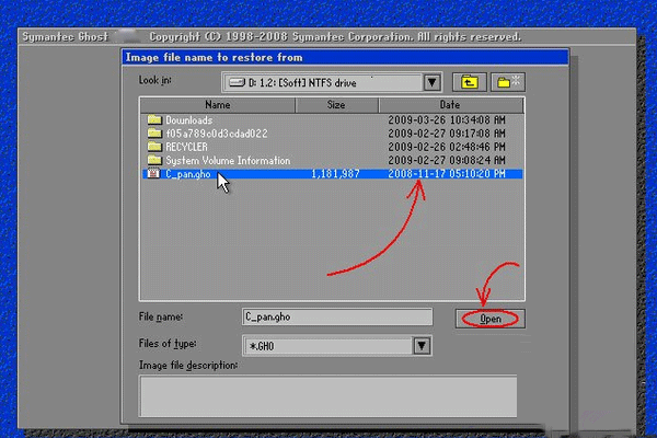 3.2、再单击“某文件夹”(如备份文件存放在“某文件夹”内)内的*.gho文件,或用下光标键选好以后再单击“Open”按钮。如镜像文件有多个,请看准文件的生成日期,通常最靠后的比较好。