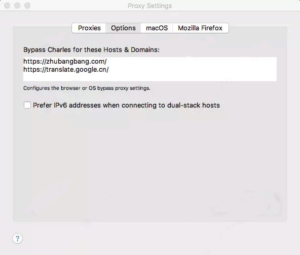这里可以设置您的浏览器/操作系统遇到哪些域名的时候,使用默认而不用Charles;配置的列表使用空格或逗号分隔,并在Charles配置其代理设置时注入浏览器。 有关详细信息,请参阅操作系统和浏览器特定选项卡。