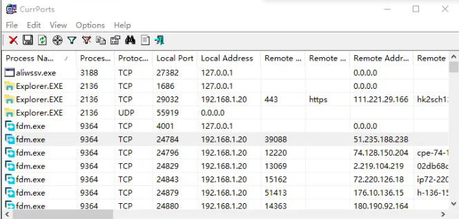 打开CurrPorts,运行后会以列表的方式列出系统中的活动连接,显示的信息项包括进程名称、进程代号、协议类型、本地端口、远程地址、远程端口等。