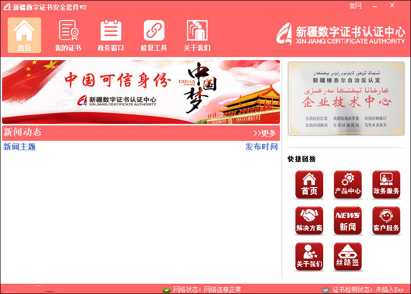 新疆数字证书安全套件是由新疆数字证书认证中心发布的一款数字证书驱动应用,也叫做新疆电子认证安全套件,软件以PKI密码技术为核心,可以帮助用户在线获取数字证书,在网络上实现身份确认、数据加解密、数字签名等安全功能,具有防假冒、防窃取、防篡改、防抵赖的特性。同时,你也可以通过本数字证书安全套件登录新疆政务窗口,在线办理相关业务,为新疆市民提供便捷服务。