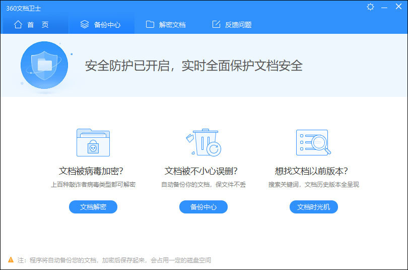 360文档卫士官方版是一款非常好用的文档保护软件,主要功能包括自动备份、实时监控和防护,帮助用户防止文件被病毒篡改或加密。它最大的亮点是能够解决敲诈者病毒问题,在文件被修改后会立即备份到隔离区,确保用户可以随时恢复文件。