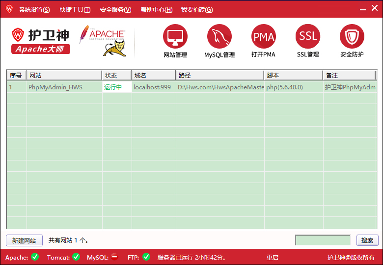 护卫神Apache建站大师是目前互联网上最优秀的一款apache环境搭建软件,可以帮助管理员在线管理服务器,其最大的特色在于:可以一键安装Apache+PHP+MySQL+FTP+伪静态+PhpMyAdmin,支持PHP5.2/3/4/5/6,并且每个网站可使用不同版本PHP;支持所有Windows系统,是全新操作系统apache环境搭建最好的辅助软件。