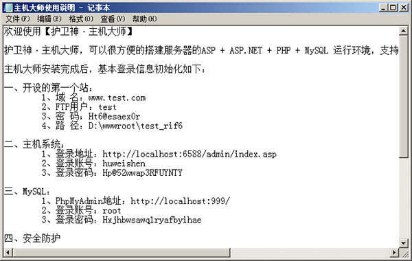 10、安装完成后,打开《主机大师使用说明》,注意其中密码都是随机的,请妥善保管,或者根据自身情况更改: