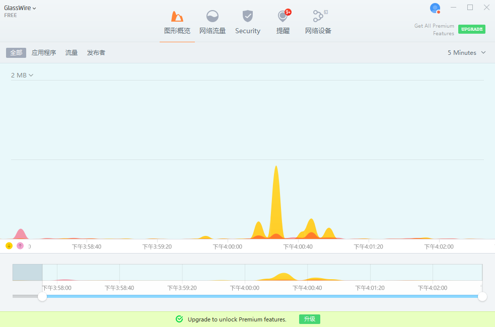 glasswire汉化版是一款非常实用且免费的防火墙和网络监测工具,不仅采用非常漂亮的图形化界面设计,还拥有图形概览、网络流量、安全、提醒和网络设备五大栏目,为用户提供了全面的网络监控和管理功能。目前glasswire软件主要功能之一是网路即时流量监测,通过该功能,用户可以实时了解当前网络的流量情况,包括上传和下载的速度、连接数量等,可以帮助用户们更好地管理和优化网络连接,此外,GlassWire还提供了网路通讯监控功能,用户可以查看当前正在使用的应用程序的网络活动,包括它们与外部服务器的通信情况。