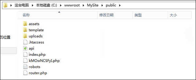 - public目录结构如下图,index.php是主文件,kMOwNCSFyI.php是后台文件,uploads是上传文件目录。