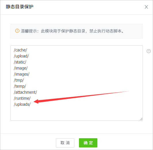 - 进入“网站防护-访问保护-静态目录保护”,将/uploads/、/runtime/添加进去,如下图: