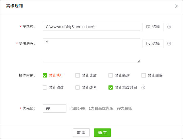 - 然后在“高级规则”,设置runtime、public\uploads目录可写。