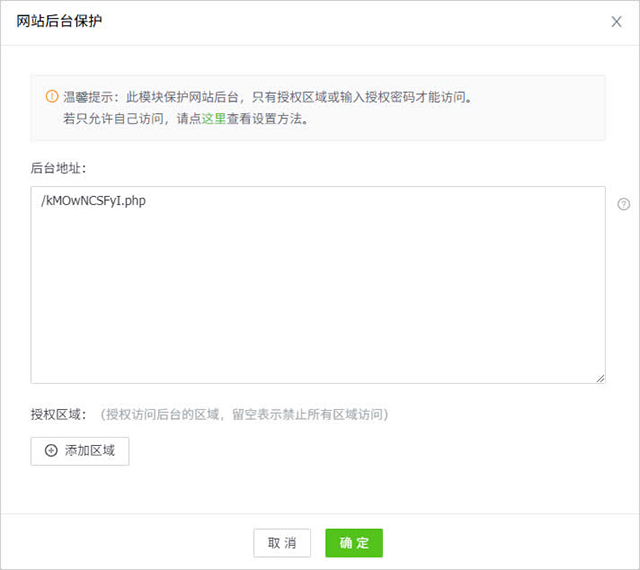 - 做好了篡改保护,还可以对网站后台进行保护,进一步提升网站安全。只需将后台地址添加到“网站后台保护”即可。如下图: