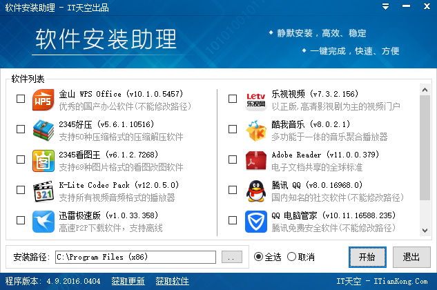 软件安装助理v4(easyinstall)是由it天空重磅推出的一款常用软件安装包,它收录了办公应用、文字输入、影视音乐、网络应用、系统辅助等多种分类的上百款常用实用软件,比如包括金山wps、好压、7z、百度拼音、腾讯视频、酷我音乐等,能够帮肋用户一键安装所有软件,极大的提高了安装效率,适用于电脑重装系统后使用,是电脑安装人员必装的好帮手。